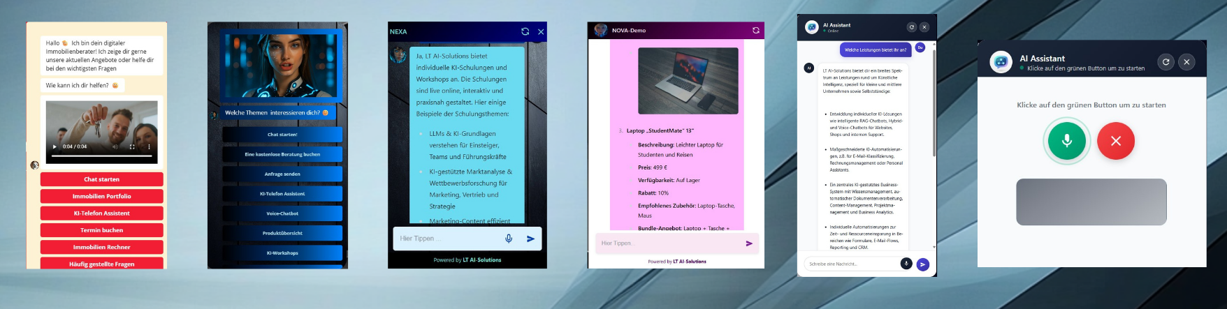 Komplexe Produkte, zu viele Klicks, zu wenig Beratung im Moment der Entscheidung. Unsere KI-Assistenten beraten wie Profis, geben präzise Antworten und führen zum nächsten Schritt. Bei LT AI-Solutions achten wir strikt auf DSGVO-Konformität, arbeiten am Stand der Technik und liefern maßgeschneiderte Systeme – passgenau für Ihr Unternehmen.